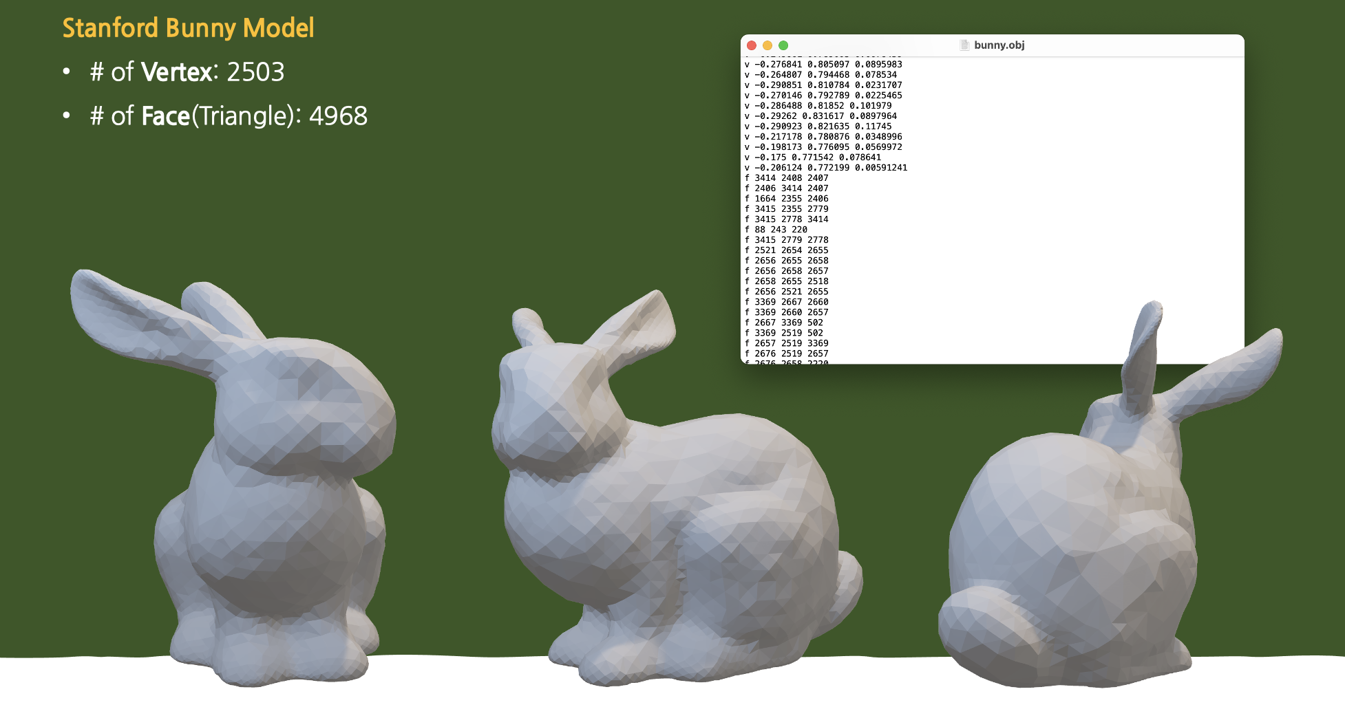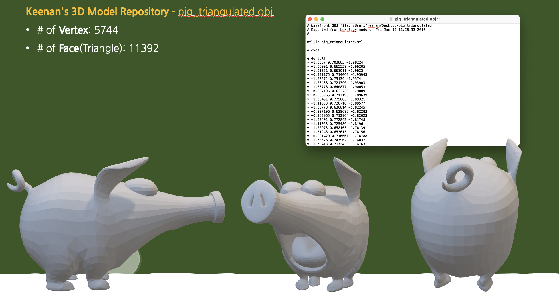 복잡한 모델들을 렌더링해보자. 레이 트레이싱에서 많이 사용하는 '스탠포드 토끼(Stanford Bunny)' 모델과, Keenan's 3D Model Repository에서 다운받은 돼지 모델을 렌더링에 사용하였다. (이제 보니, 스탠포드 토끼보다는 face와 vertex 개수가 좀 더 적은, 비교적 간단한 토끼 모델인 것 같다... 소위 짝퉁...? ㅎㅁㅎ)