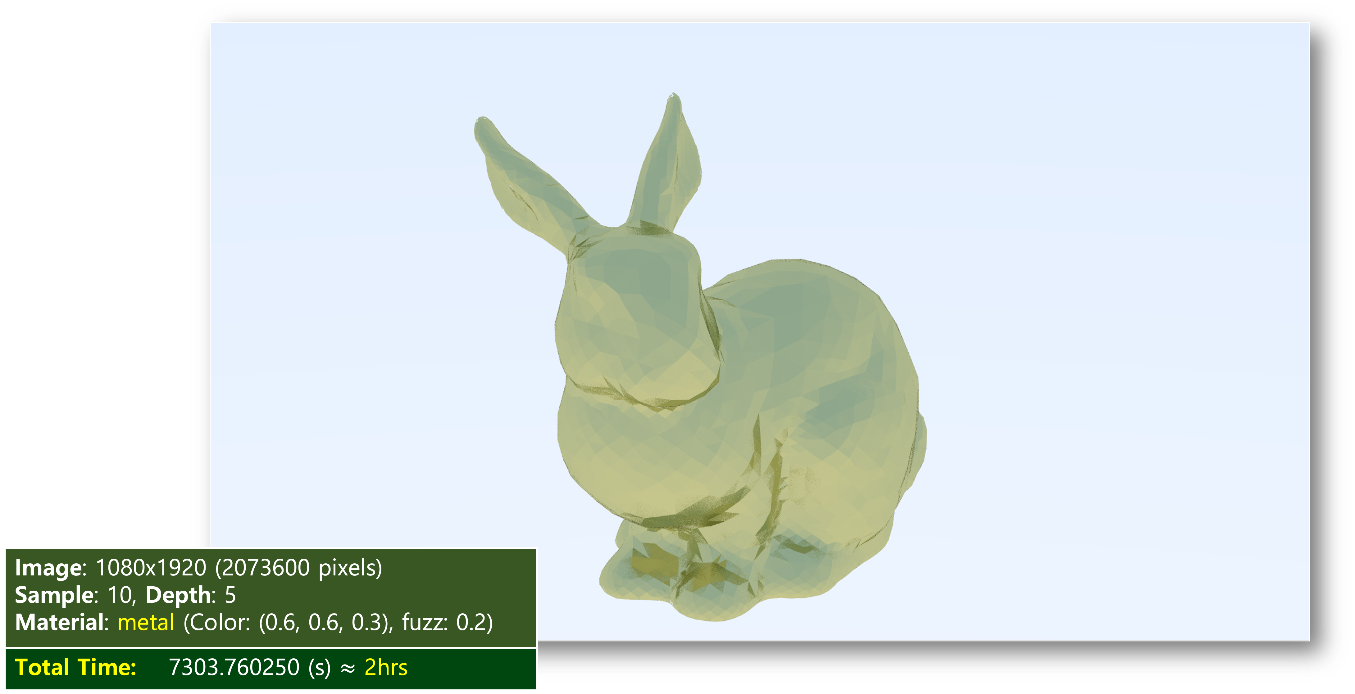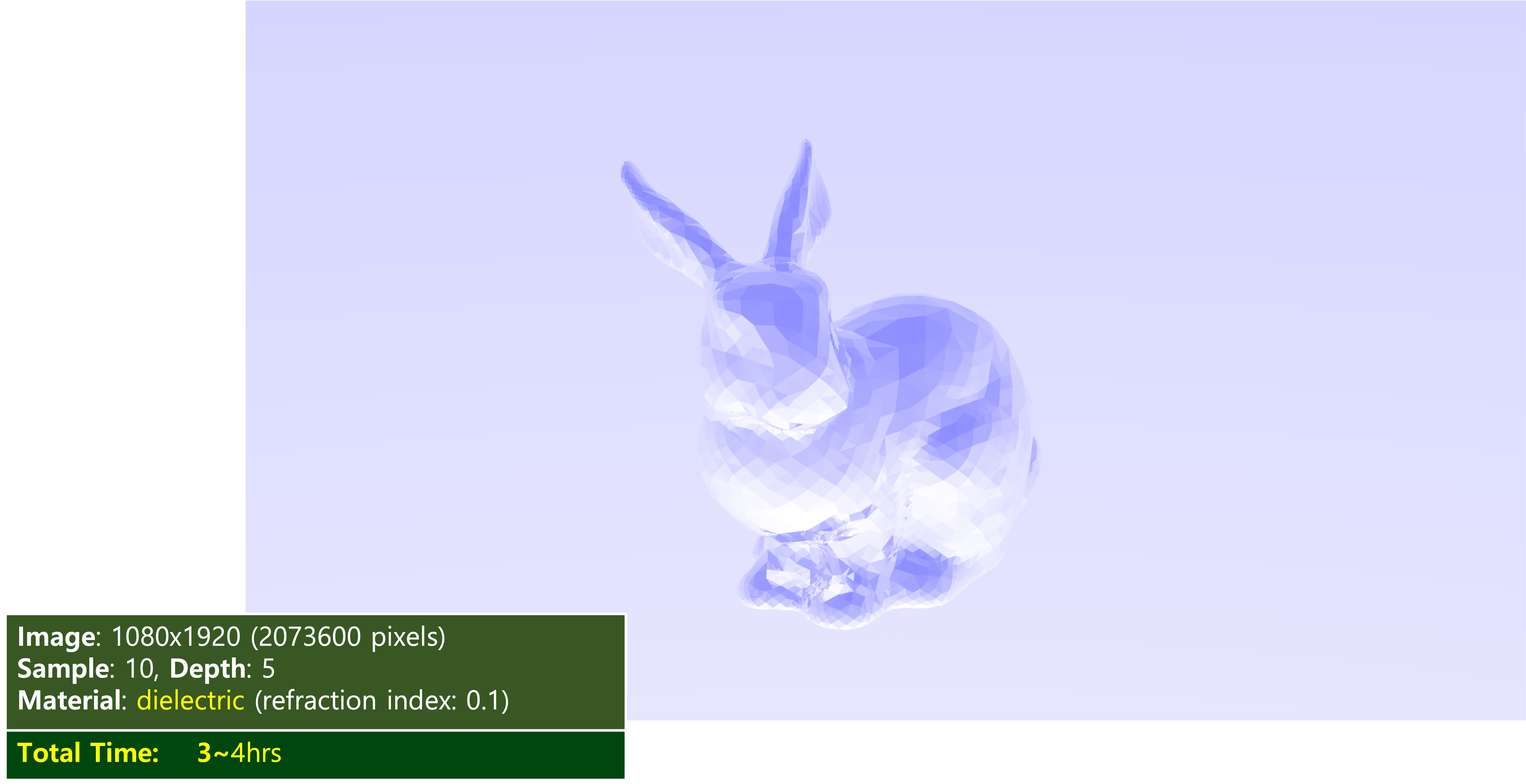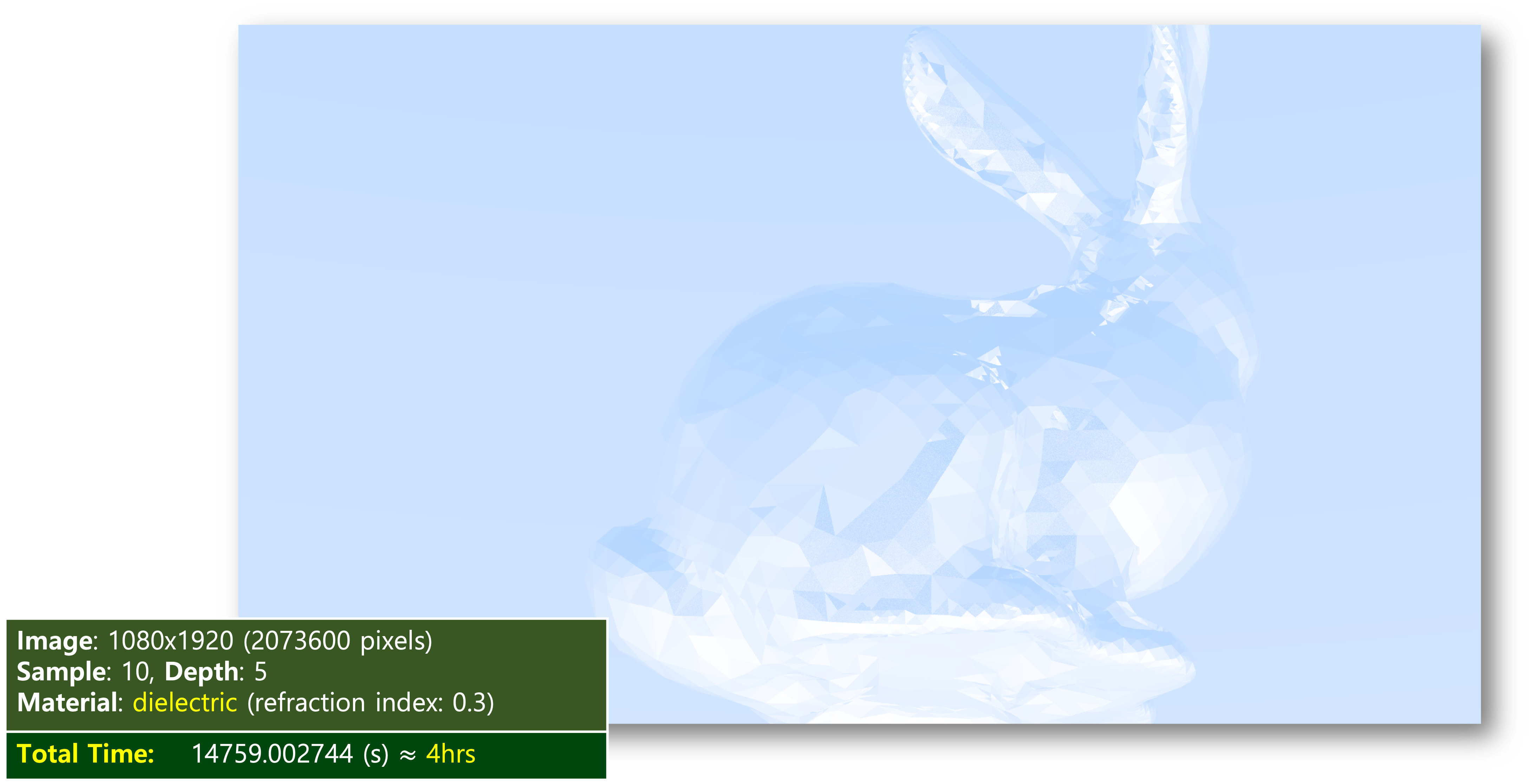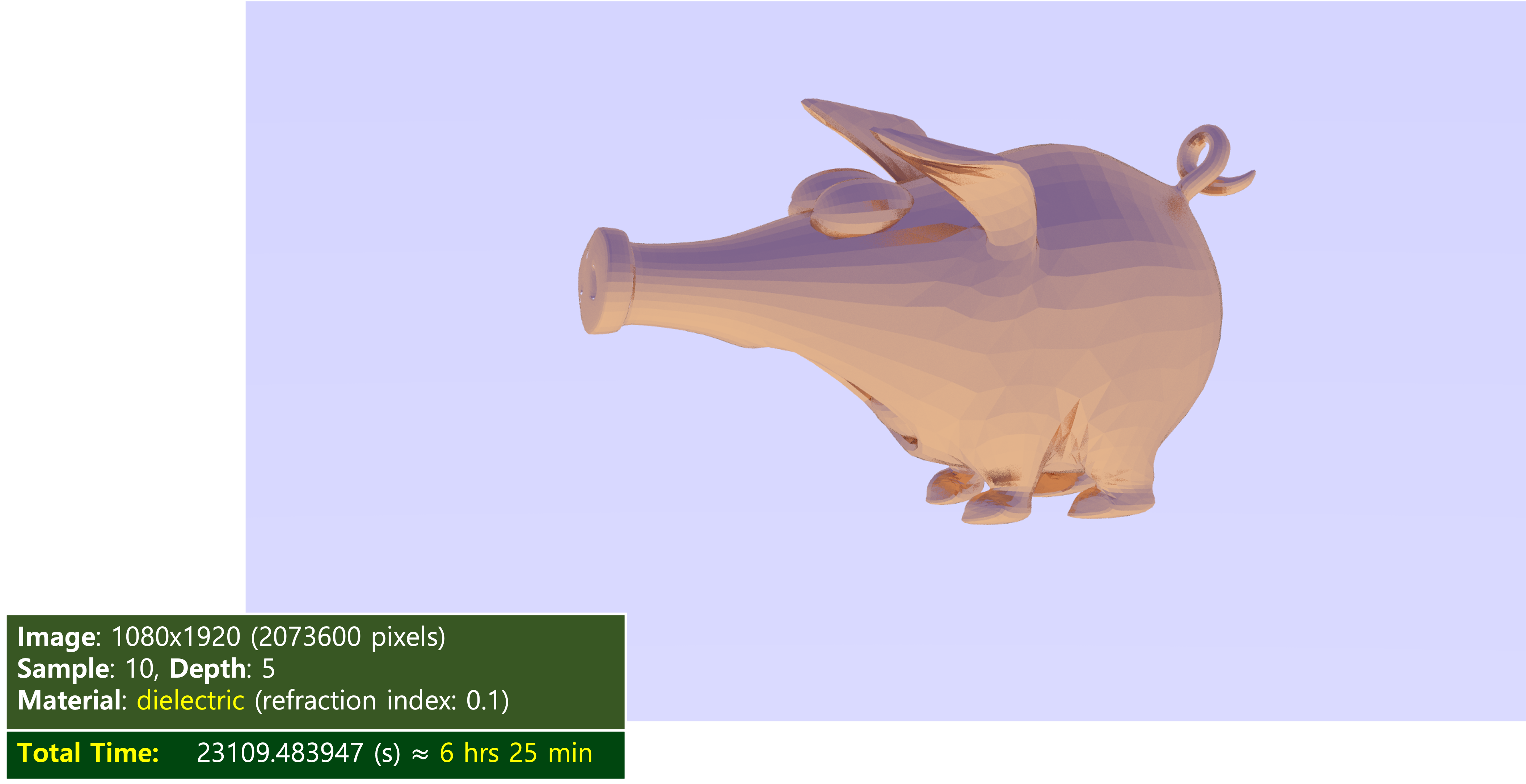 이미지의 해상도와 샘플(sample) 개수, depth 값을 동일하게 하여 렌더링하는 데 걸린 시간을 측정하였다. (사실, 중간 중간에 잠시 컴퓨터가 멈추는 바람에 실제보다 더 길게 측정이 되었다...)